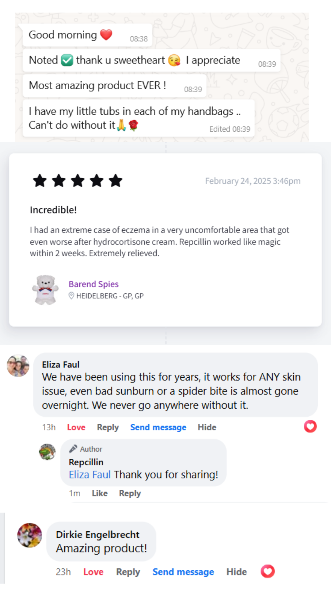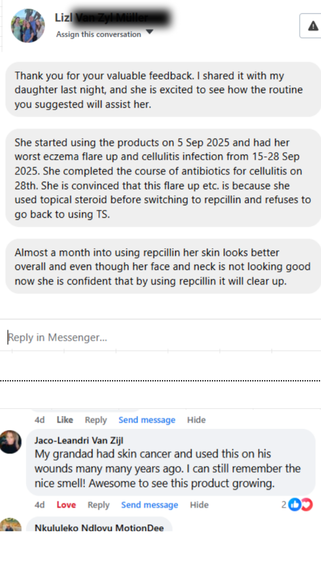 Nandi was at breaking point. Years of dyshidrotic eczema left her hands swollen, raw, and wrapped in bandages just to get through the day. She had tried everything — doctors, medications, endless creams — and nothing helped. She told us she was tired, embarrassed, and losing hope. Repcillin was the last product she was willing to try. From her “worst day” on 26 June to just a few days later, everything changed. The burning stopped, the swelling eased, and by 3 July her hands looked like a different person’s. She says Repcillin didn’t just heal her skin… it gave her life back.